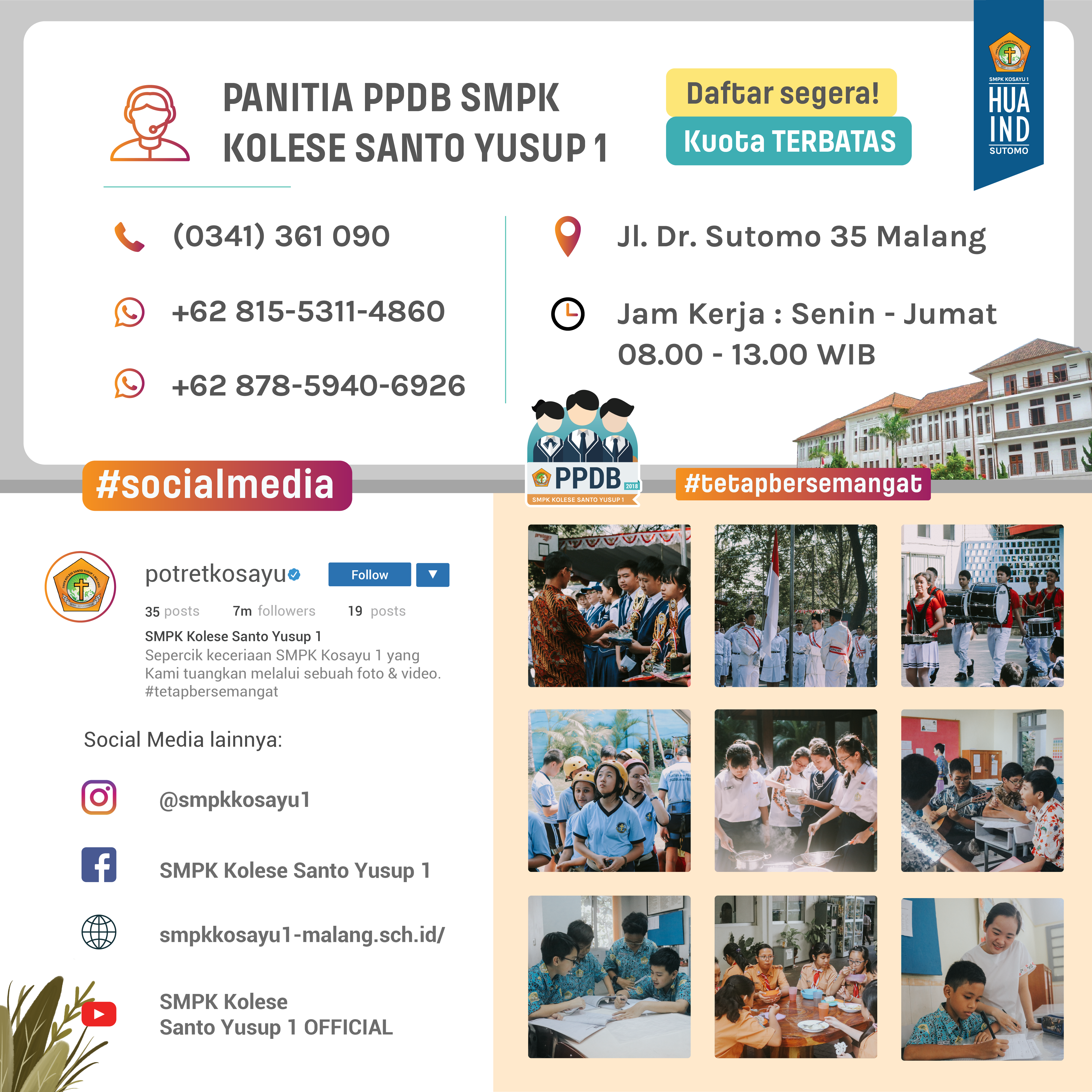 SMPK Kolese Santo Yusup 1 Malang yang juga dikenal sebagai SMP Hua Ind Sutomo membuka pintu bagi adik-adik SD yang ingin bertumbuh menjadi pribadi dengan karakter dan kemampuan akademis unggul melalui program Penerimaan Peserta Didik Baru (PPDB) untuk tahun ajaran 2019/2020.