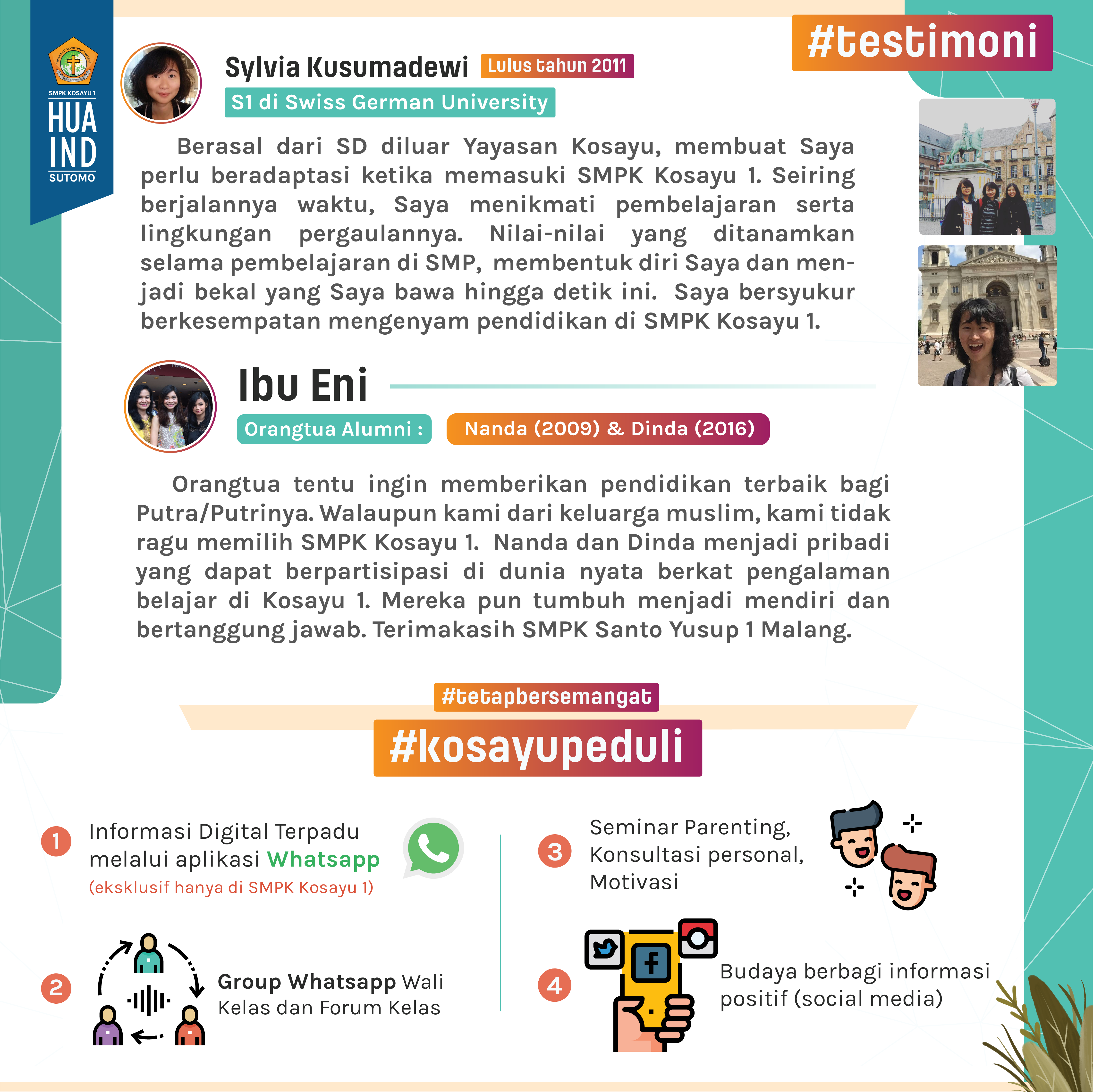 Dengan tetap memegang nilai-nilai masa lalu yang diusung para pendirinya, SMP Hua Ind Sutomo pun berdinamika mengikuti perkembangan zaman. Dalam penerimaan peserta didik baru (PPDB) dari tahun ke tahun, SMPK Kosayu 1 Malang mempersiapkan diri mendampingi pendidikan bagi generasi milenium, bahkan generasi Z. Salah satu pola pembelajaran yang dikembangkan oleh SMP Hua Ind Sutomo adalah Klinik Belajar. Bagaimana Klinik Belajar mengarahkan peserta didik yang semakin sering digempur gadget-gadget canggih? Bagaimana Klinik Belajar menjembatani komunikasi dan hubungan yang lebih humanis terhadap peserta didik? Jawabnya…hanya jika Anda bergabung dan bersinergi bersama SMPK Kolese Santo Yusup 1- Hua Ind Sutomo.